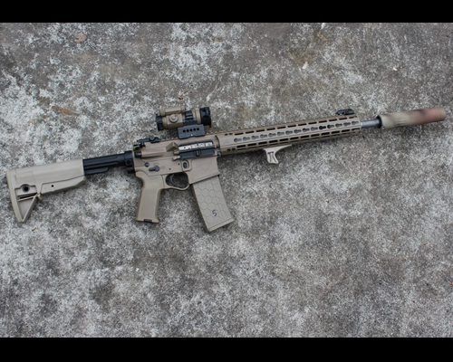 On the top is one of the first LRK Jackdaw customs chambered in 5.56 and coated in FDE Cerakote. Other features include: 16" Ballistic Advantage barrel with mid-length gas system, Bravo Company Gunfighter stock and Magpul K2 pistol grip and BCM KAG handguard stop, Teal Blue Bravo ambi-mag release, Aimpoint Optic in an ARMS mount, Magpul BUIS Pro sights, 30rd mag by Hexmag. The upper is an Aero Precision M4E with matching keymod handguard. This crazy bird's song is quieted down with an AAC m4-2000 cramped over it's beak. Not to worry, when we go loud we get the benefit of the new Battle Comp muzzle break that is now 51T mount compatible.